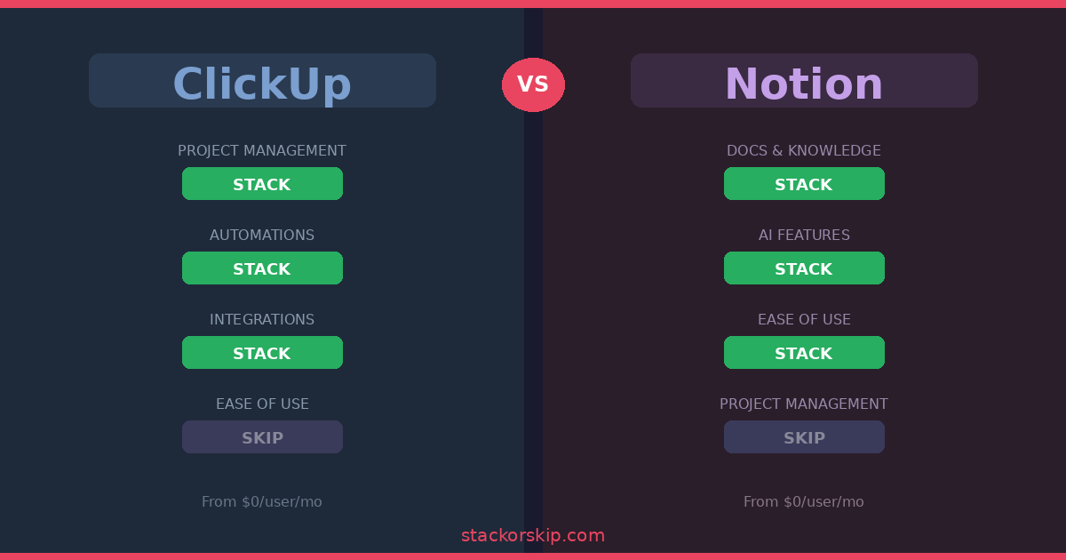 Last updated: April 2026 | By Stack or Skip Quick verdict: Notion vs ClickUp — which should you pick? ClickUp is better for teams that need structured project management with built-in time tracking, Gantt charts, and automations. Notion is better for individuals and small teams who want a flexible, beautiful workspace for docs, wikis, and … Read more